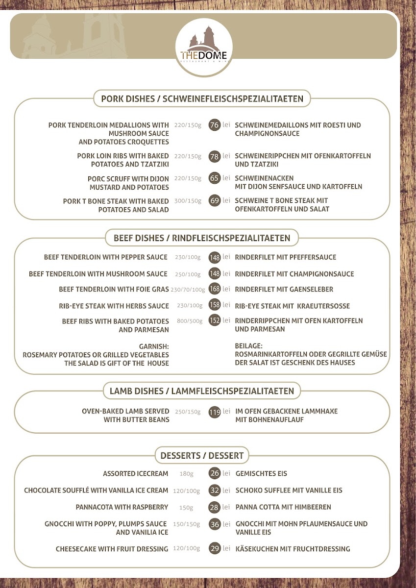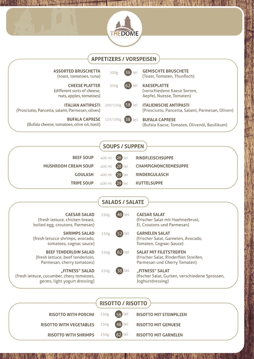 The Dome’s menu offers a thoughtful blend of refined dishes and comforting classics, suited to those seeking a quiet, elegant dining experience. The selection ranges from fresh, lighter options like shrimp salad and bruschetta to heartier plates such as pork tenderloin, lamb leg with beans, or duck breast paired with mashed potatoes and berries. Each dish fits well into the restaurant’s calm and inviting atmosphere, making them ideal for relaxed dinners or special meals shared with friends and loved ones.